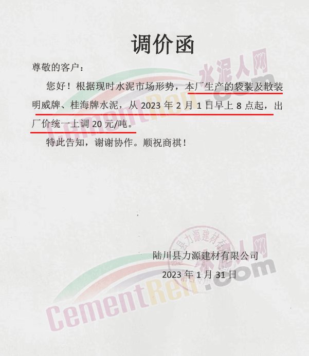 同期,陸路川縣力源建材有限公司通知稱(chēng),根據(jù)現(xiàn)時(shí)市場(chǎng)形勢(shì),本廠生產(chǎn)的袋裝及散裝明威牌、桂海牌水泥從2月1日8時(shí)起,出廠價(jià)統(tǒng)一上調(diào)20元/噸。