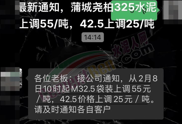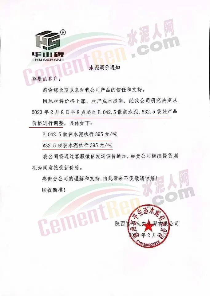 企業(yè)調(diào)價(jià)通知中提到,為響應(yīng)陜西省環(huán)保錯(cuò)峰生產(chǎn)政策,造成公司原材料上漲,生產(chǎn)成本增加,為保證持續(xù)向客戶提供高品質(zhì)產(chǎn)品和服務(wù)經(jīng)公司研究決定自2月8日10時(shí)起對(duì)公司各型號(hào)水泥出廠價(jià)格進(jìn)行調(diào)整。調(diào)價(jià)后,如客戶繼續(xù)提貨則視為同意價(jià)格。