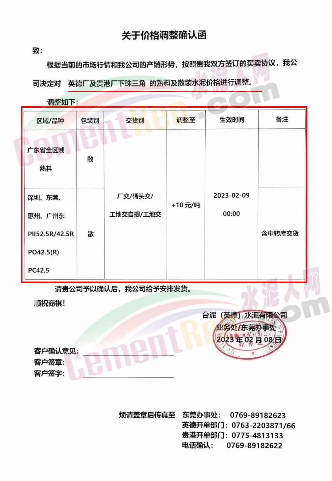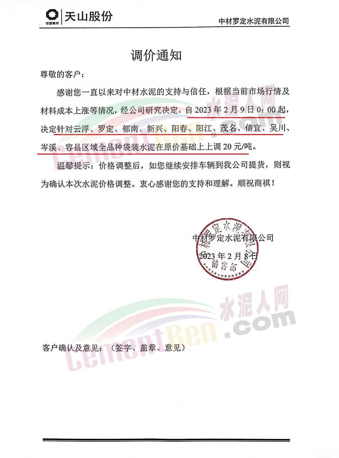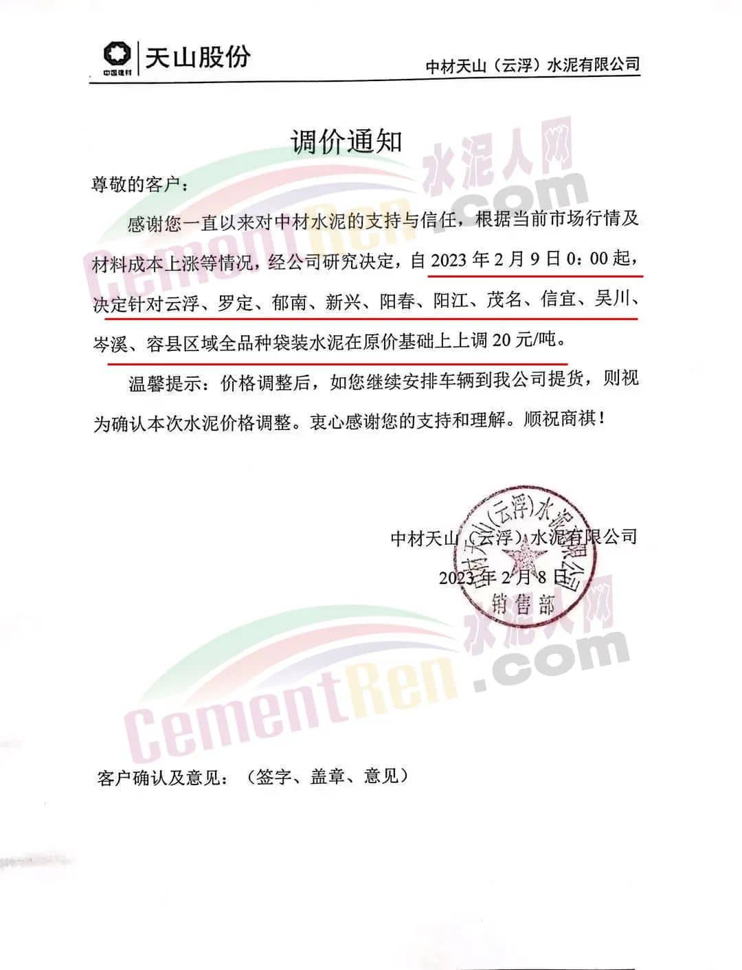 中材天山(云浮)水泥有限公司、中材亨達(dá)水泥有限公司、中材羅定水泥有限公司調(diào)價(jià)通知稱(chēng),根據(jù)當(dāng)前市場(chǎng)行情及材料成本上漲等情況,經(jīng)公司研究決定,自2023年2月9日0時(shí)起決定針對(duì)云浮、羅定、郁南、新興、陽(yáng)春、陽(yáng)江、茂名、信宜、吳川、岑溪、容縣區(qū)域全品種袋裝水泥在原價(jià)基礎(chǔ)上上調(diào)20元/噸。