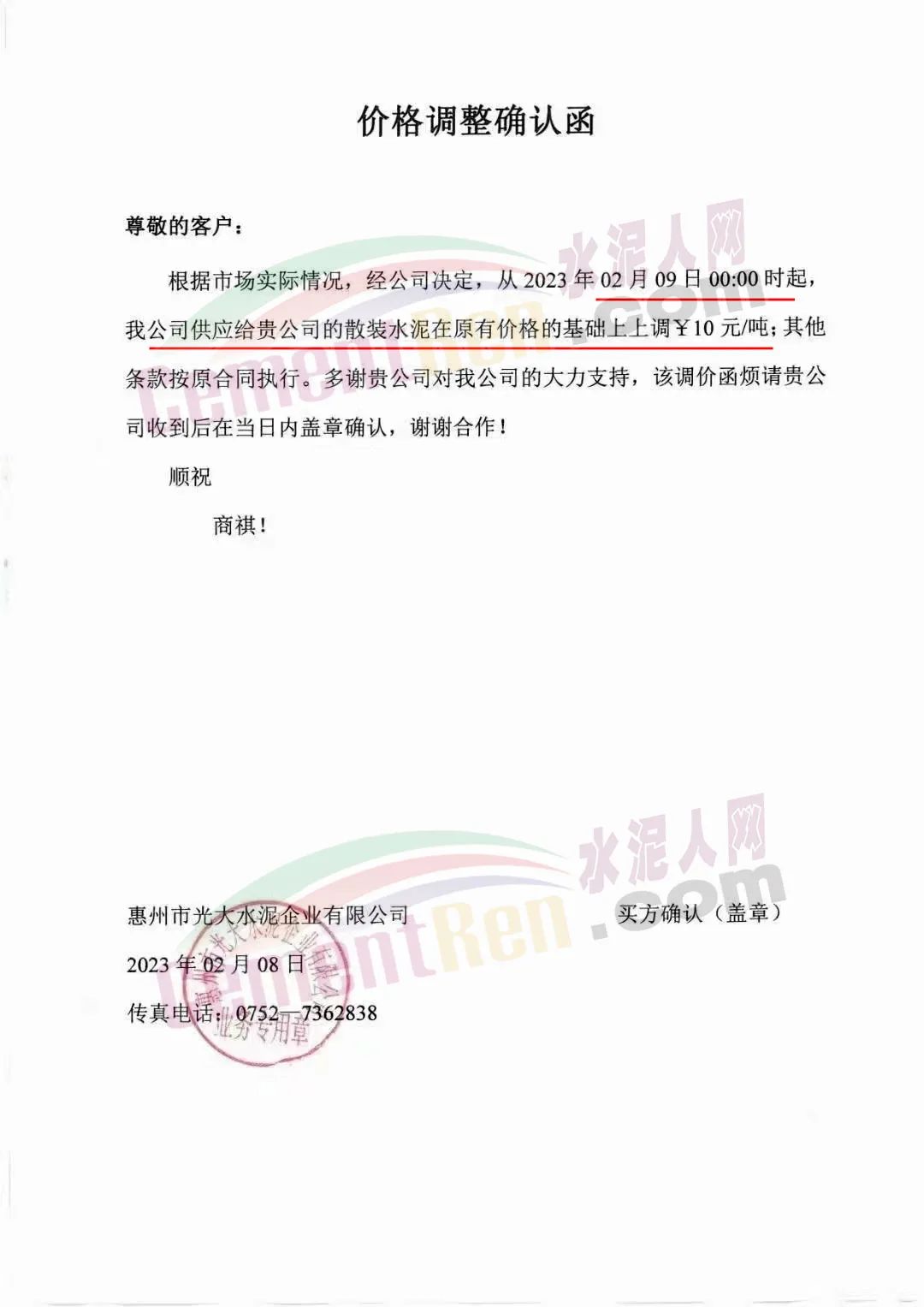 惠州光大水泥企業(yè)有限公司通知稱(chēng),根據(jù)市場(chǎng)實(shí)際情況,公司決定從2月9日0時(shí)起,散裝水泥在原有價(jià)格的基礎(chǔ)上上調(diào)10元/噸。