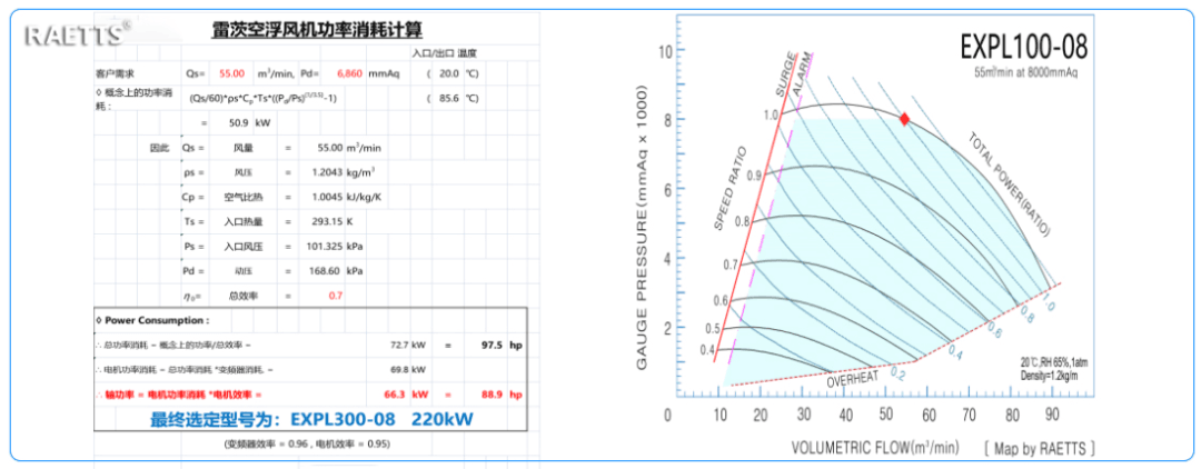 改造前使用的三葉羅茨風機工作狀態(tài)為1用0備,常開,運行時間為24h/d連續(xù)運行,根據(jù)設備工況,該水泥企業(yè)的核算選型如下圖所示:
