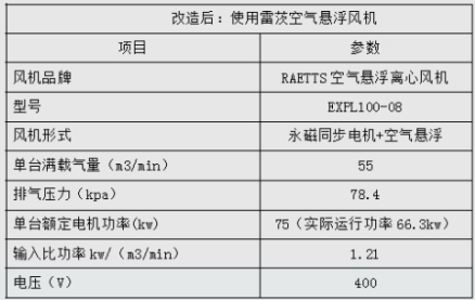 根據(jù)用能單位的現(xiàn)場實際情況,采用高速永磁變頻空氣懸浮離心風機情況風量:55m³/min;壓力:78.4kPa;電機實際功率:66.3x1=66.3kW(實際運行功率64.5kW);比功率:1.21kW(m³/min)。