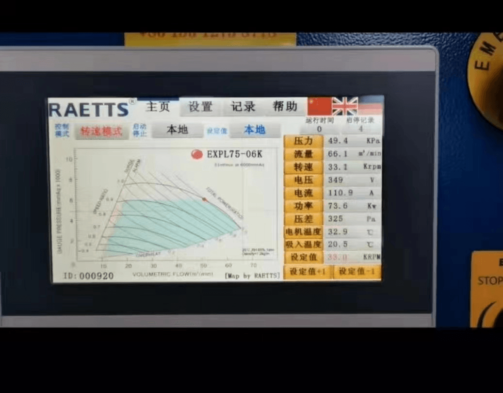 系統(tǒng)情況如下:風量:55x1=55m³/min;壓力:68.6kPa;電機功率:105x1=105kW(實際運行功率105kW);比功率:105:55=1.91kW(m³/min)。