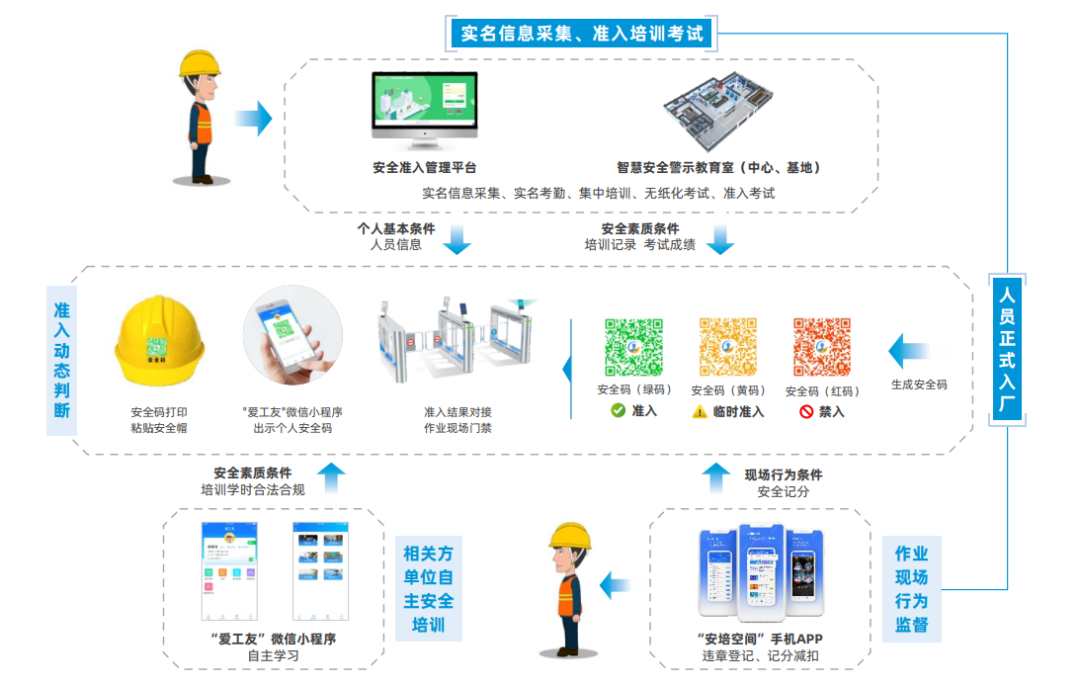 水泥企業(yè)相關(guān)方人員安全準(zhǔn)入管理,以相關(guān)方人員“個(gè)人基本條件+安全素質(zhì)條件+現(xiàn)場行為條件”為依據(jù),綜合研判人員準(zhǔn)入狀態(tài),生成安全碼,實(shí)現(xiàn)人因風(fēng)險(xiǎn)等級可視化。同時(shí),提供數(shù)據(jù)采集終端、安全培訓(xùn)終端、手機(jī)APP等應(yīng)用工具,用于人員信息采集、準(zhǔn)入培訓(xùn)考核、作業(yè)行為監(jiān)督,實(shí)現(xiàn)系統(tǒng)化準(zhǔn)入管理,嚴(yán)控人因風(fēng)險(xiǎn)。
