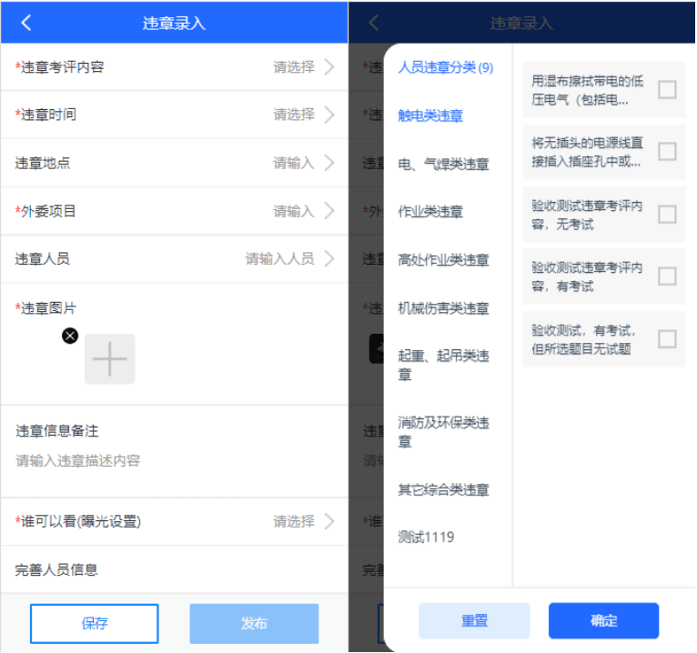 平臺(tái)中內(nèi)置了違章考評標(biāo)準(zhǔn)庫,水泥企業(yè)單位管理員在作業(yè)現(xiàn)場可通過安培空間APP進(jìn)行拍照記錄人員違章行為后,選擇違章考評標(biāo)準(zhǔn)快速規(guī)范地錄入違章。系統(tǒng)將根據(jù)違章考評內(nèi)容,自動(dòng)扣減人員違章記分,并自動(dòng)下發(fā)反違章培訓(xùn)學(xué)習(xí)任務(wù)。