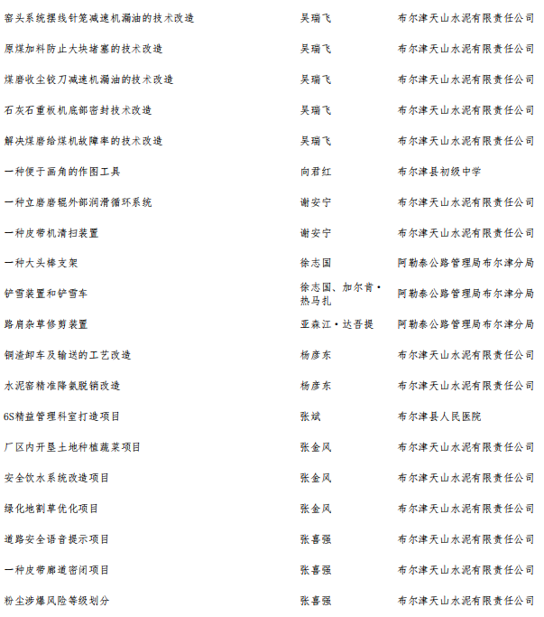 2023年布爾津天山水泥有限責任公司深入開展以“五小”創(chuàng)新活動,有效激活了員工的原動力,強力助推了創(chuàng)優(yōu)建設。獲得維吾爾自治區(qū)總工會“五小”優(yōu)秀創(chuàng)新成果49項,獲得維吾爾自治區(qū)總工會“五小”示范性優(yōu)秀創(chuàng)新成果1項。