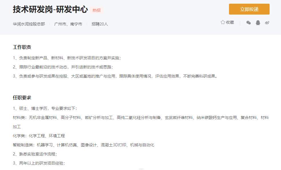 技術(shù)研發(fā)崗共招聘20人,任職要求碩士、博士學(xué)歷專業(yè)要求材料類:無機非金屬材料、高分子材料、巖礦分析與加工、高純二氧化硅分析與制備、玄武巖纖維材料、納米碳酸鈣生產(chǎn)與應(yīng)用、復(fù)合材料、材料加工;化學(xué)類:化學(xué)工程、環(huán)境工程;智能制造類:機器學(xué)習(xí)、計算機仿真、圖像設(shè)計、混凝土3D打印、機械與自動化。并且要求熟悉實驗室運作流程和兩年以上的研發(fā)項目經(jīng)驗。