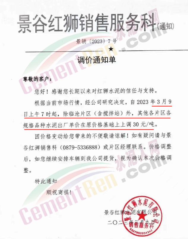 日前,云南區(qū)域景谷紅獅銷售服務(wù)科通知,根據(jù)當(dāng)前市場行情,經(jīng)公司研究決定自2023年3月9日上午7時起,除臨滄片區(qū)(含攪拌站)外,其他各片區(qū)各規(guī)格品種水泥出廠價上調(diào)30元/噸。