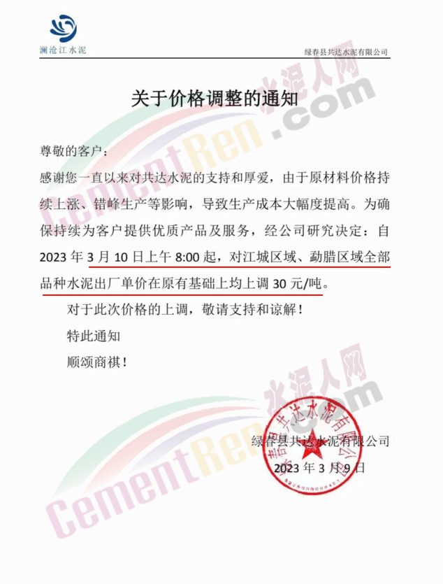 綠春共達(dá)水泥有限公司通知,由于原材料價格持續(xù)上漲、錯峰生產(chǎn)等影響,導(dǎo)致生產(chǎn)成本大幅度提高。為確保持續(xù)為客戶提供優(yōu)質(zhì)產(chǎn)品及服務(wù),經(jīng)公司研究決定,自2023年3月10日上午8時起,對江城區(qū)域、勐臘區(qū)域全部品種水泥出廠價上調(diào) 30元/噸。