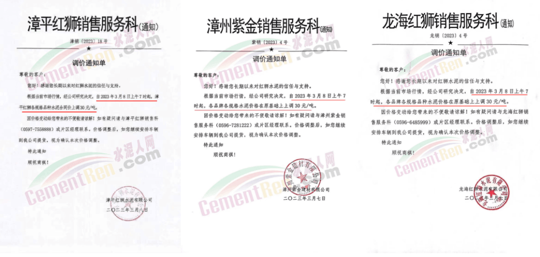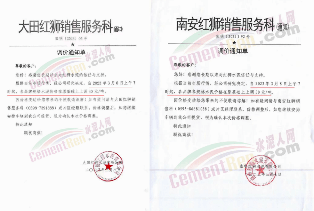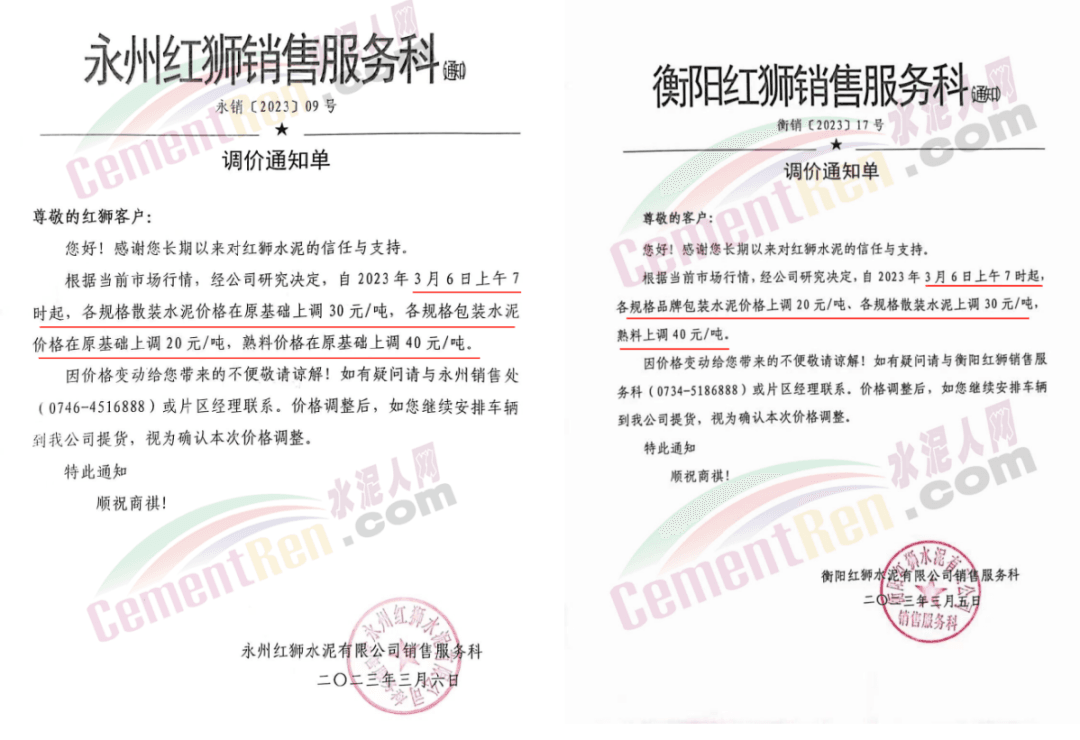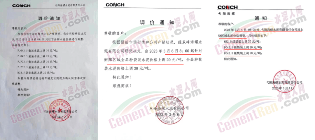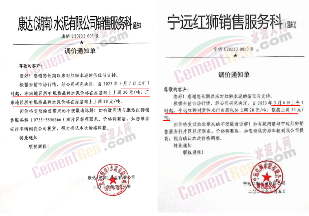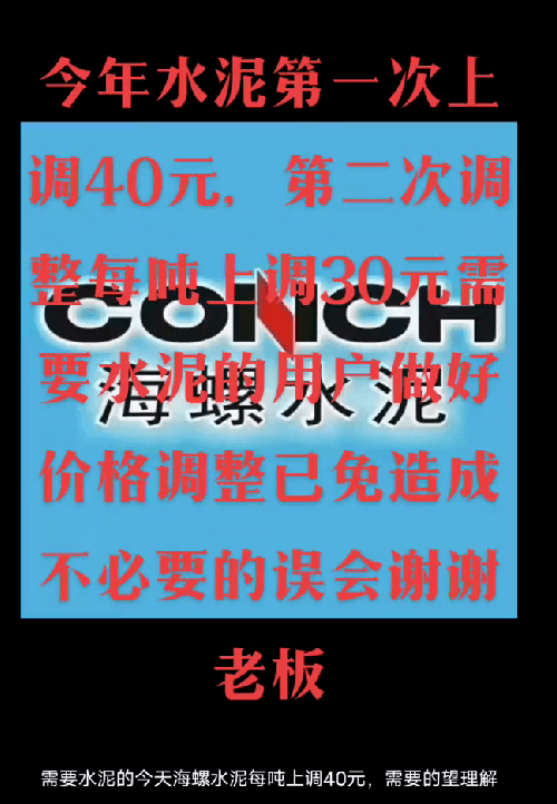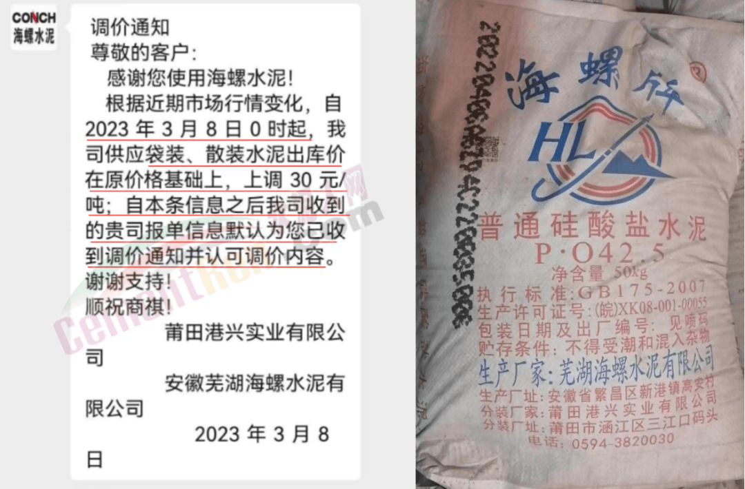 經(jīng)銷海螺水泥的揭陽市軒海水泥有限公司通知,根據(jù)目前市場情況,經(jīng)公司研究決定,自2023年3月8日零時起,公司全品種散裝水泥出廠結(jié)算價格在現(xiàn)行價格基礎(chǔ)上上調(diào)15元噸;袋裝水泥出廠結(jié)算價格在現(xiàn)行價格基礎(chǔ)上上調(diào)10元/噸。