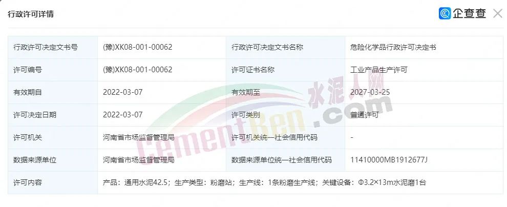 企業(yè)生產(chǎn)許可證編號:(豫)XK08-001-00062,有效期至2027年3月25日。產(chǎn)品為通用水泥42.5;生產(chǎn)類型為粉磨站;擁有一條粉磨生產(chǎn)線;關(guān)鍵設(shè)備為Ф3.2╳13m水泥磨1臺。