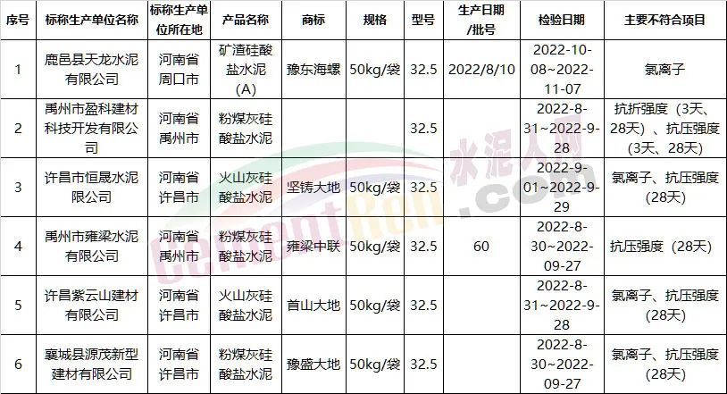 不合格品抽檢產(chǎn)品分別為礦渣硅酸鹽水泥(A)、粉煤灰硅酸鹽水泥、火山灰硅酸鹽水泥;標(biāo)稱單位分別為鹿邑縣天龍水泥有限公司、禹州市盈科建材科技開發(fā)有限公司、許昌市恒晟水泥有限公司、禹州市雍梁水泥有限公司、許昌紫云山建材有限公司、襄城縣源茂新型建材有限公司,主要不符合項目為氯離子、抗壓,抗折強度。不合格品商標(biāo)分別為豫東海螺、堅鑄大地、雍梁中聯(lián)、首山大地、豫盛大地。