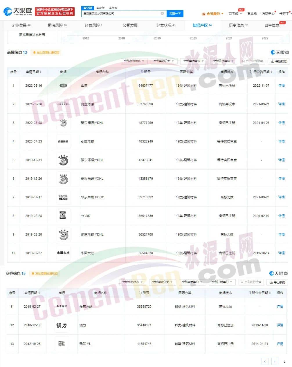 水泥人網(wǎng)注意到,鹿邑縣天龍水泥有限公司旗下共有13條注冊商標(biāo)信息,其中“豫東海螺”相關(guān)兩條為無效商標(biāo),一條為等待實質(zhì)審查階段。另有一條為“豫東海鏍”信息已注冊。