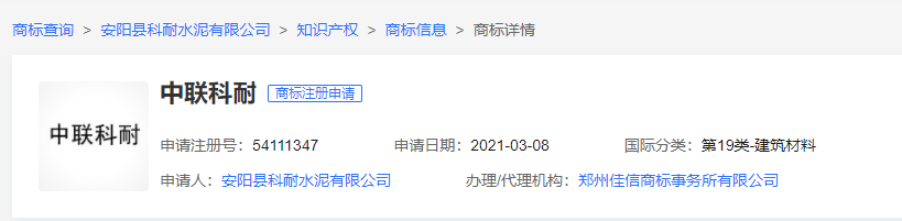 據(jù)查詢(xún),“中聯(lián)科耐”注冊(cè)商標(biāo)申請(qǐng)人為安陽(yáng)縣科耐水泥有限公司。
