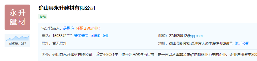 水泥包裝袋上標(biāo)稱(chēng)的“確山縣永升水泥有限公司” 未查詢(xún)到相關(guān)的工商注冊(cè)信息。通過(guò)模糊查詢(xún)找到一家注冊(cè)地址位于確山縣朗陵街道迎賓大道中段南側(cè)268號(hào)的確山縣永升建材有限公司,但未查到相關(guān)商標(biāo)注冊(cè)信息,也未查到工業(yè)品生產(chǎn)許可證信息。