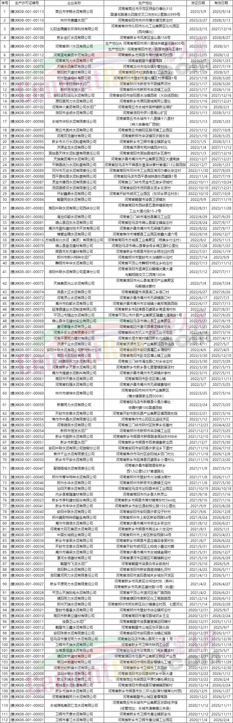 河南省210個(gè)編號(hào)水泥產(chǎn)品工業(yè)品生產(chǎn)許可證有效