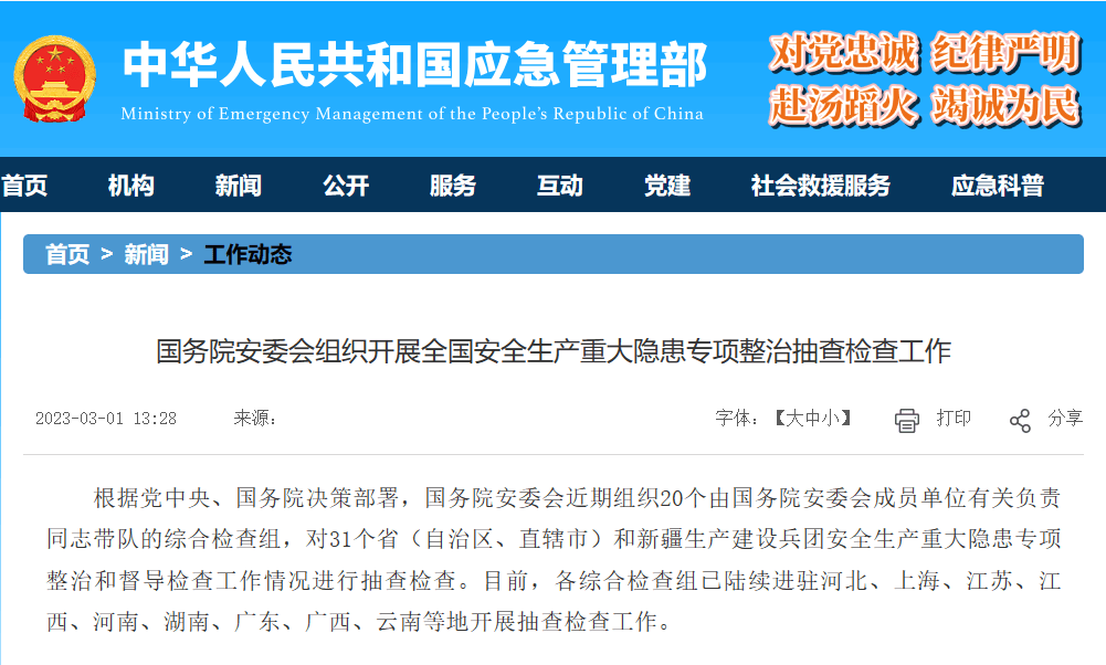 近日,從應急管理部網(wǎng)站獲悉,根據(jù)黨中央、國務院決策部署,國務院安委會近期組織20個由國務院安委會成員單位有關負責同志帶隊的綜合檢查組,對31個省(自治區(qū)、直轄市)和新疆生產(chǎn)建設兵團安全生產(chǎn)重大隱患專項整治和督導檢查工作情況進行抽查檢查。目前,各綜合檢查組已陸續(xù)進駐河北、上海、江蘇、江西、河南、湖南、廣東、廣西、云南等地開展抽查檢查工作。
