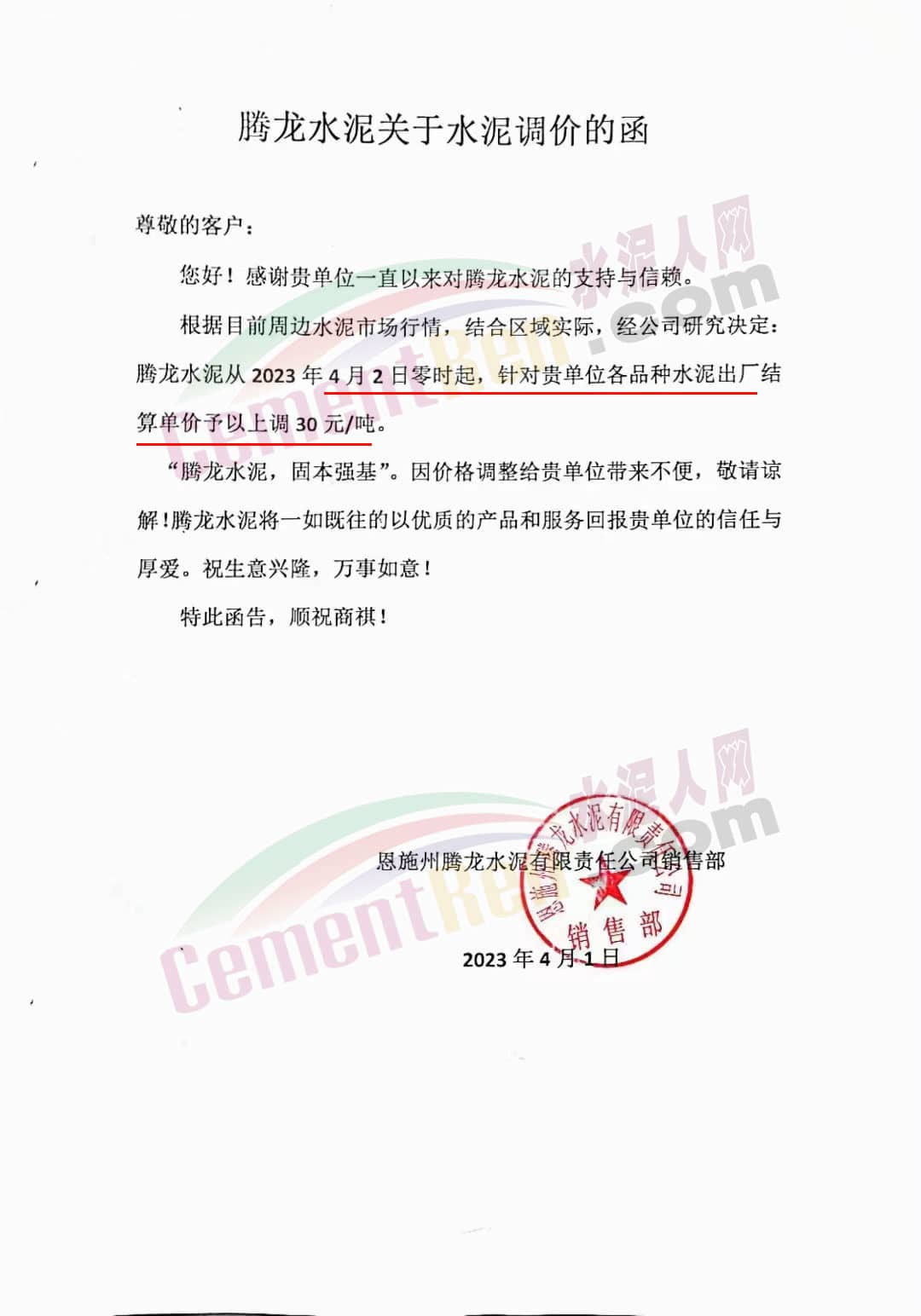 恩施州騰龍水泥有限責(zé)任公司銷售部通知,根據(jù)目前周邊水泥市場行情,結(jié)合區(qū)域?qū)嶋H,經(jīng)公司研究決定騰龍水泥從2023年4月2日零時起,各品種水泥出廠結(jié)算單價上調(diào)30元/噸。