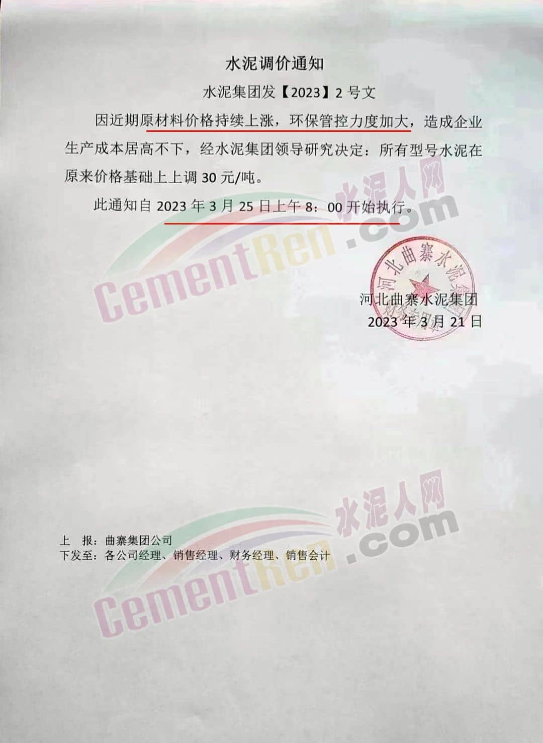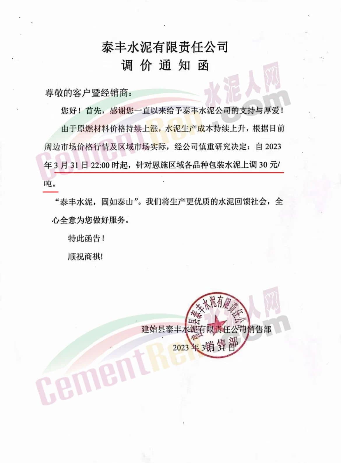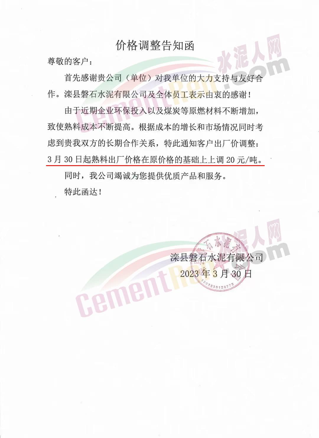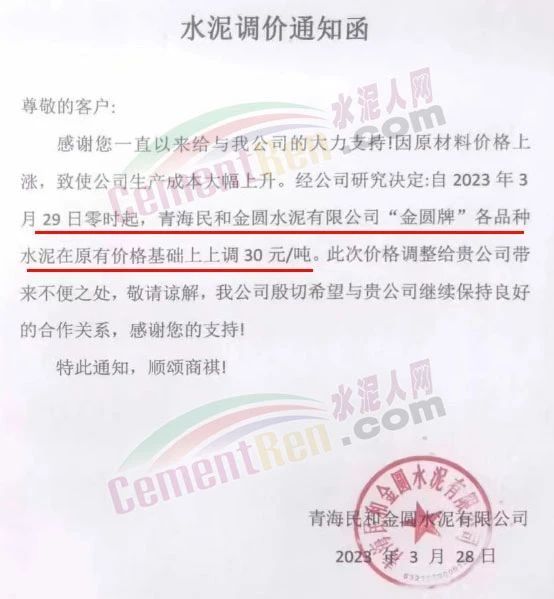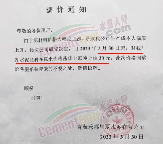 青海樂都華夏水泥有限公司通知,由于原材料價格大幅度上漲,導(dǎo)致我公司生產(chǎn)成本大幅度上升。經(jīng)總公司研究決定,自2023年3月30日起,對公司各水泥品種在原來價格基礎(chǔ)上每噸上調(diào)30元。