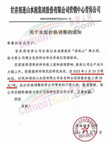 甘肅祁連山水泥集團(tuán)股份有限公司營中心青海公司通知,因原煤等原燃材料價格上漲和疫情影響,致使公司生產(chǎn)成本大幅上升。現(xiàn)根據(jù)庫存情況經(jīng)研究決定,自2023年3月28日零時起,對民和祁連山水泥有限公司各品種水泥銷售價格上調(diào)30元/噸。