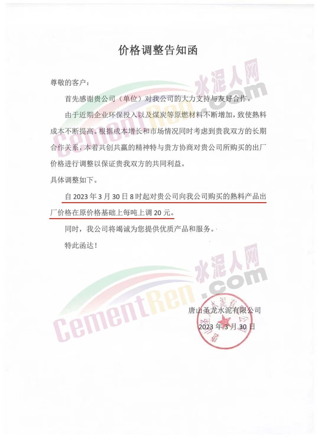 唐山圣龍水泥有限公司通知,由于近期企業(yè)環(huán)保投入以及煤炭等原燃材料不斷增加,致使熟料成本不斷提高。自2023年3月30日8時起熟料產(chǎn)品出廠價格在原價格基礎(chǔ)上每噸上調(diào)20 元。