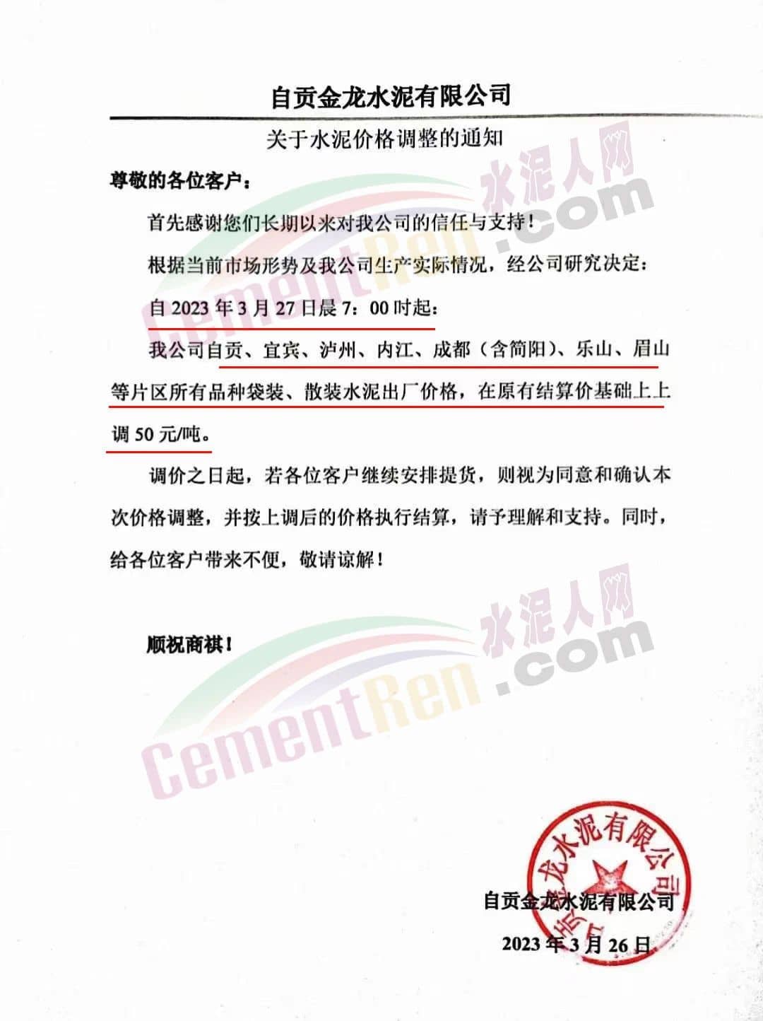 自貢金龍水泥有限公司通知,根據(jù)當(dāng)前市場形勢及我公司生產(chǎn)實際情況,經(jīng)公司研究決定自2023年3月27日晨7時起,自貢、宜賓、瀘州、內(nèi)江、成都(含簡陽)、樂山、眉山等片區(qū)所有品種袋裝、散裝水泥出廠價格,在原有結(jié)算價基礎(chǔ)上上調(diào)50元/噸。