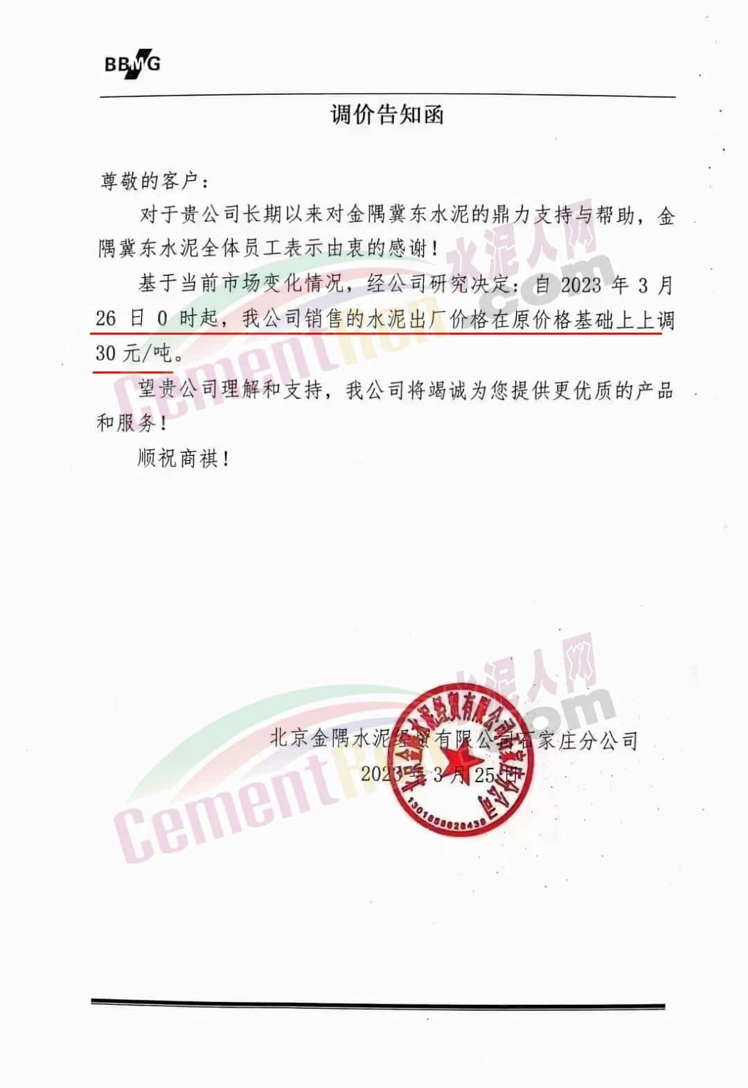 北京金隅水泥有限公司石家莊分公司通知基于當(dāng)前市場變化情況,經(jīng)公司研究決定自2023年3月26日0時起,公司銷售的水泥出廠價格在原價格基礎(chǔ)上上調(diào)30元/噸。
