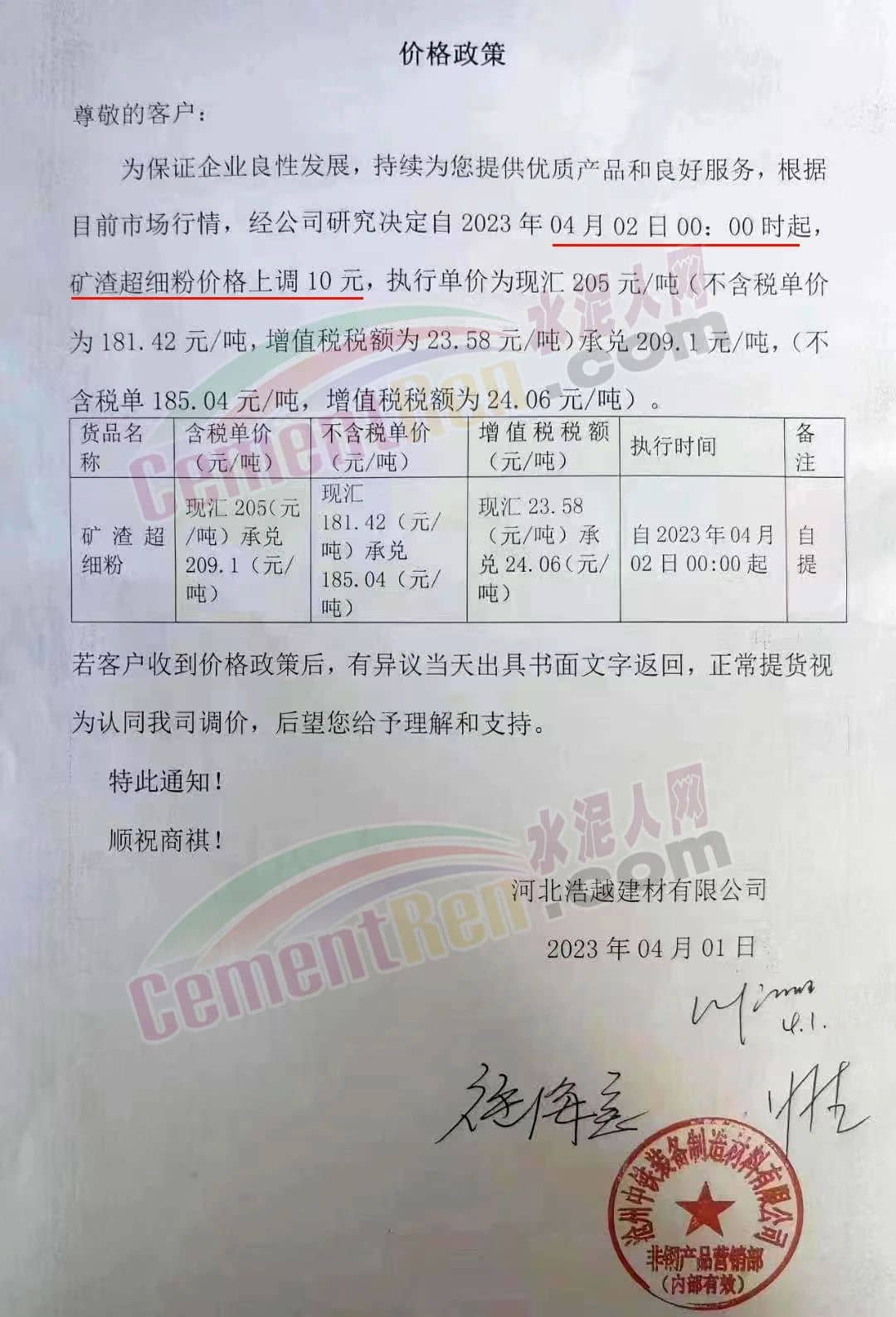 河北浩越建材有限公司通知,根據(jù)目前市場行情,經(jīng)公司研究決定自2023年4月2日0時起礦渣超細(xì)粉價格上調(diào)10元/噸。