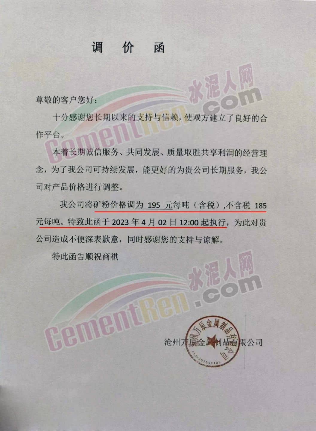 滄州萬辰金屬制品著有限公司通知于2023年4月2日12時起執(zhí)行礦粉價格調(diào)整為195元每噸(含稅),不含稅185元每噸。