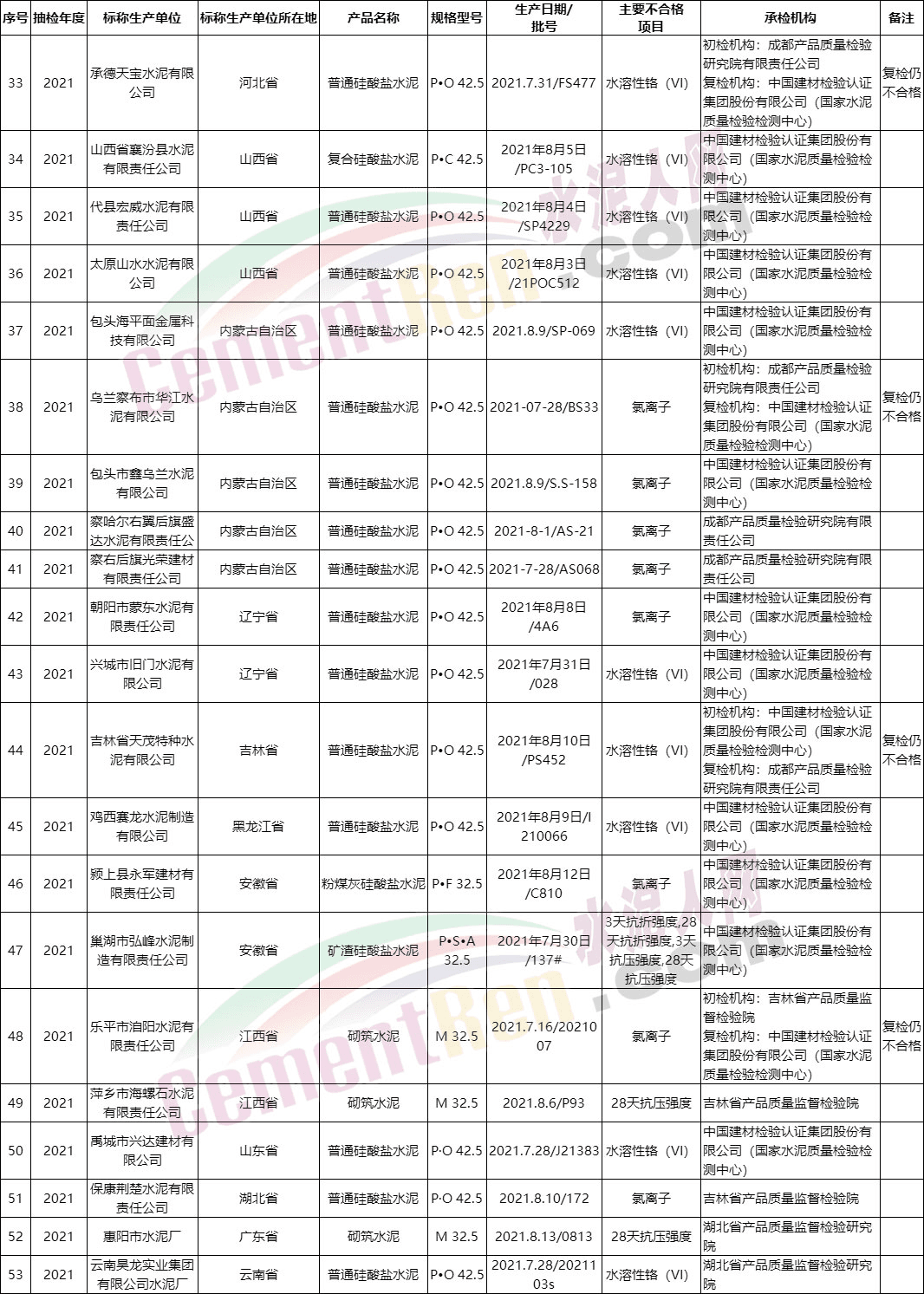 另有4家企業(yè)有連續(xù)兩年抽檢不合格的現(xiàn)象。不合格項目涉及氯離子、抗壓強度、抗折強度、三氧化硫、水溶性鉻(VI)等。