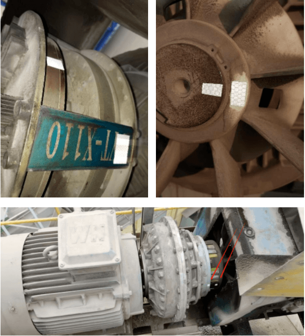 1.設(shè)備停機(jī)時對各設(shè)備聯(lián)軸方式進(jìn)行檢查、清理,選擇合適位置粘貼反光貼紙。因現(xiàn)場粉塵較大,為防止粘貼不牢固原因?qū)е略O(shè)備運(yùn)行后反光貼紙掉落影響檢測,部分位置選擇多處檢測點(diǎn)粘貼并進(jìn)行標(biāo)記。