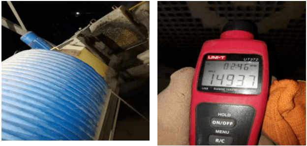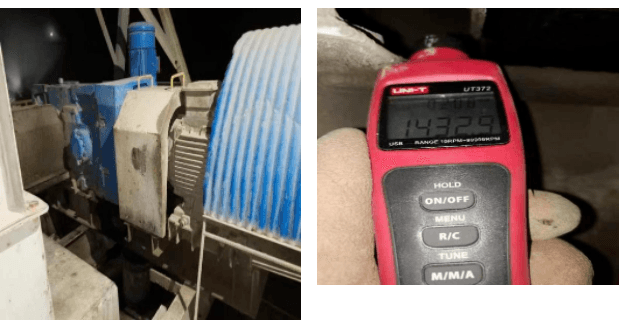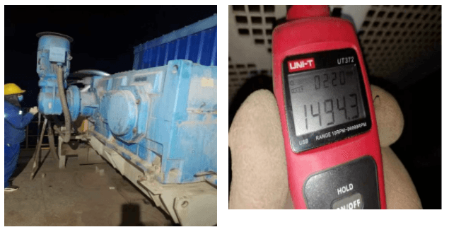 2.設(shè)備運(yùn)行后,使用激光測速儀照射反光貼紙,分別測試并記錄各設(shè)備主、從動軸運(yùn)行轉(zhuǎn)速。