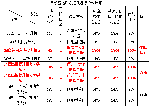 2、測量時間為水泥生產(chǎn)淡季,工況為間歇式運(yùn)行,載荷較低,甚至部分工況部分時間為空載運(yùn)行,實(shí)際載荷對液偶運(yùn)行轉(zhuǎn)速影響較明顯,故測得目前液偶輸出轉(zhuǎn)速均較高,滿料運(yùn)行后液偶輸出轉(zhuǎn)速將會有所降低,傳動效率將處于95%左右。