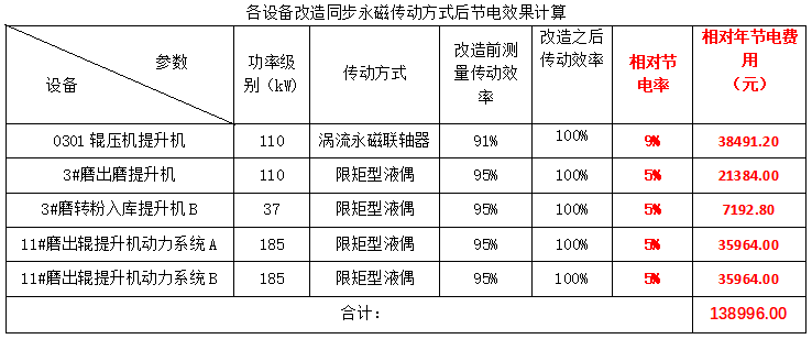 使用同步永磁耦合器針對液偶、渦流永磁工況進(jìn)行改造,可明顯提升設(shè)備運(yùn)行效率,降低損耗,從而達(dá)到節(jié)能的效果,數(shù)據(jù)計算結(jié)果如下表所示: