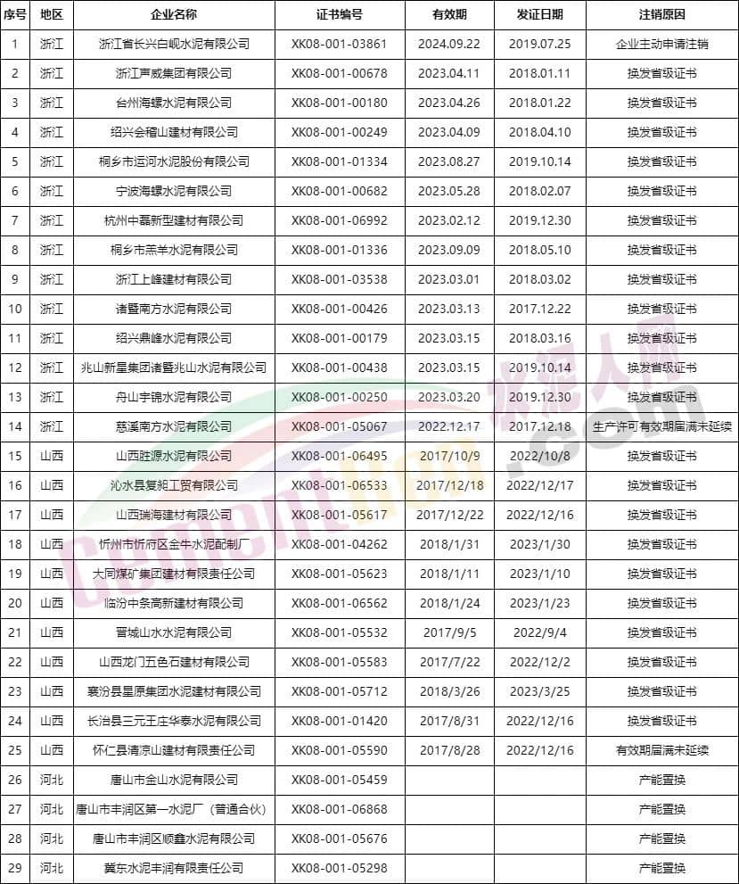 據(jù)查詢,近期浙江、河南、山西三省市場(chǎng)監(jiān)管部門發(fā)布了注銷水泥企業(yè)生產(chǎn)許可通告,近30家企業(yè)生產(chǎn)許可證被注銷。