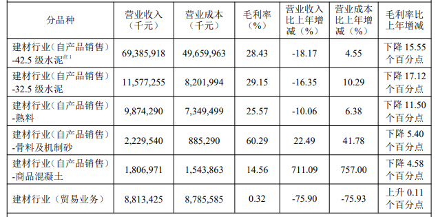 從生產(chǎn)成本方面來看,企業(yè)自有產(chǎn)品銷售營業(yè)成本同比上年增加7.96%,毛利率同比上年下降15.18%。企業(yè)自有水泥、熟料、砂石骨料及混凝土成本均有不同程度的增加,毛利率下滑明顯。