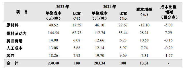 2022年海螺水泥水泥熟料綜合成本同比上升13.31%。水泥熟料綜合成本中燃料及動(dòng)力、折舊費(fèi)用及人工成本均有所增加。其中,受煤炭價(jià)格及電價(jià)上漲影響,燃料及動(dòng)力成本增加28.21%,成本比重增加7.29%。