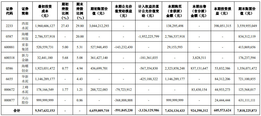 同期,海螺水泥認(rèn)購西部建設(shè)股份事項(xiàng)仍在進(jìn)行中。截至2022年末,海螺水泥證券投資情況如下: