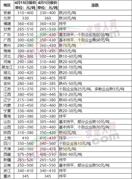 慘淡!全國(guó)20多個(gè)省市水泥價(jià)格跌!跌!跌!