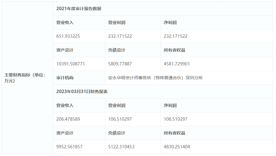 披露信息中提到的企業(yè)主要財務(wù)指標顯示,2021年度企業(yè)利潤總額達232.17萬元,資產(chǎn)總計達1.039億元,當年營業(yè)收入651.93萬元,凈利潤232.17萬元,負債總計5809.77887萬元。2023年03月31日財務(wù)報表資產(chǎn)總計約9952.561857萬元,營業(yè)收入206.478589萬元,凈利潤106.510297萬元,負債總計5122.310453萬元。