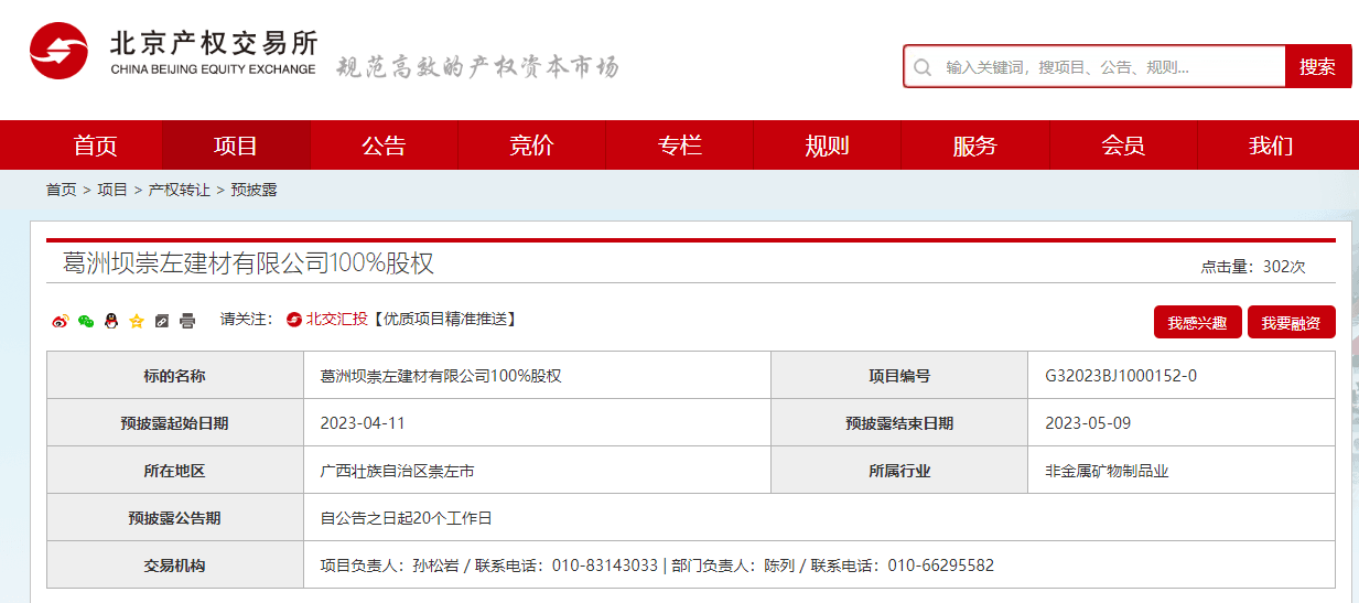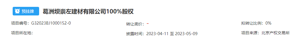 葛洲壩崇左建材有限公司100%股權(quán)預(yù)掛牌,披露結(jié)束日期為2023年5月9日。企業(yè)2023年3月31日財務(wù)報表顯示,資產(chǎn)總計27936.07萬元,負債總計27836.07萬元,所有者權(quán)益100萬元。