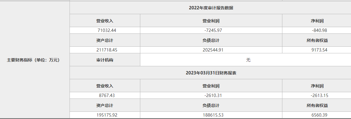 企業(yè)2023年3月31日財務(wù)報表顯示,資產(chǎn)總計195175.92萬元,負債總計188615.53萬元,所有者權(quán)益6560.39萬元,營業(yè)收入8767.43萬元,營業(yè)利潤-2612.68萬元,凈利潤-2613.15萬元。