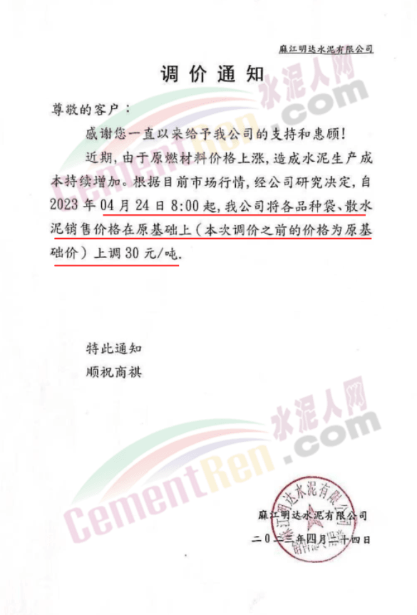 同期,貴州區(qū)域水泥價(jià)格迎來(lái)回暖行情。麻江明達(dá)水泥有限公司通知稱,近期由于原燃材料價(jià)格上漲,造成水泥生產(chǎn)成本持續(xù)增加。根據(jù)目前市場(chǎng)行情,經(jīng)公司研究決定,自2023年4月24日8時(shí)起,公司將各品種袋、散水泥銷售價(jià)格在原基礎(chǔ)上上調(diào)30元/噸。