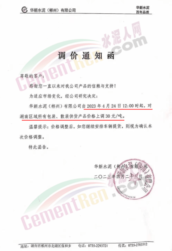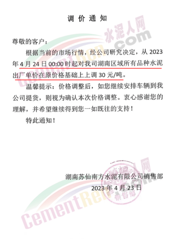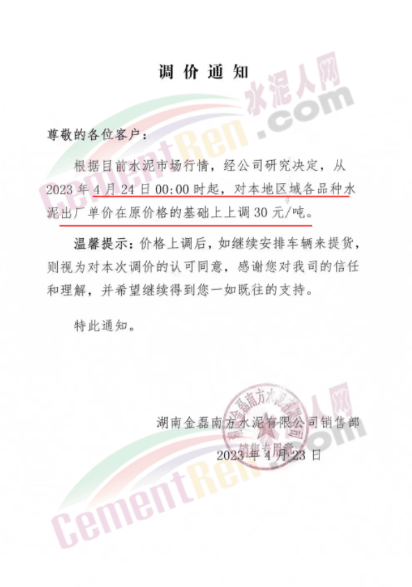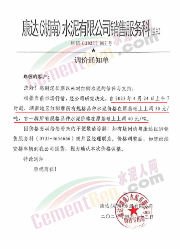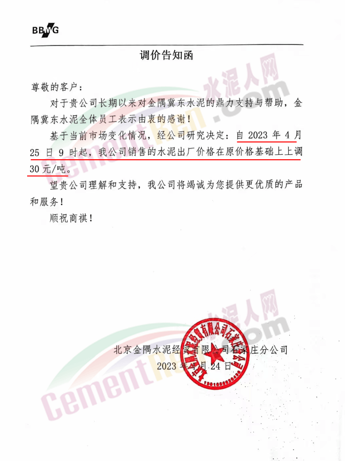 北京金隅水泥經(jīng)貿(mào)有限公司石家莊分公司通知稱,基于當(dāng)前市場(chǎng)變化情況,經(jīng)公司研究決定,自2023年4月25日9時(shí)起,公司銷售的水泥出廠價(jià)格在原價(jià)格基礎(chǔ)上上調(diào)30元/噸。