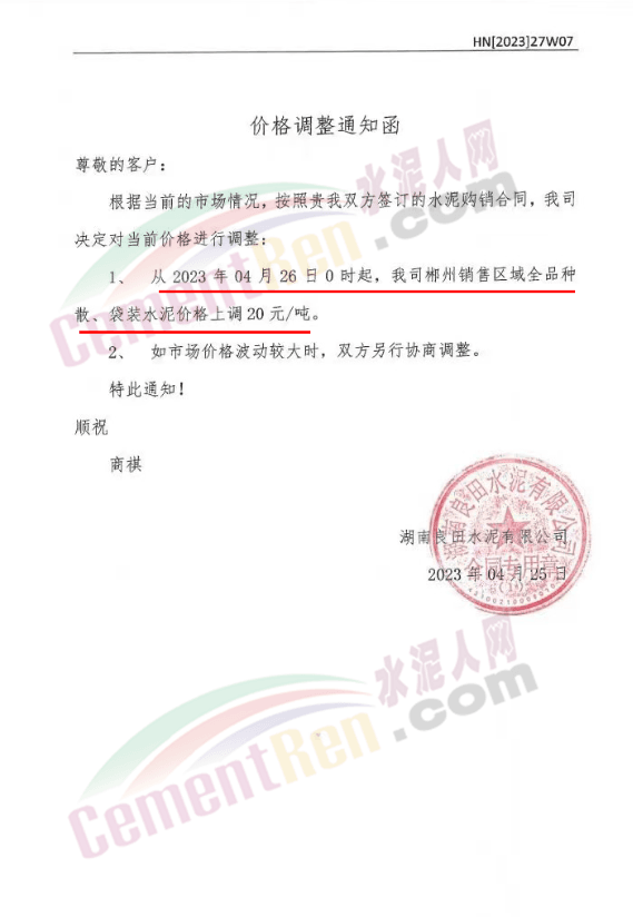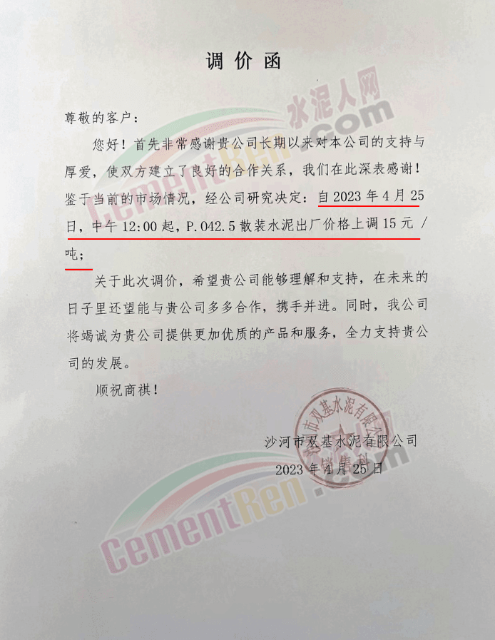 沙河市雙基水泥有限公司通知稱,鑒于當(dāng)前的市場(chǎng)情況,經(jīng)公司研究決定:自2023年4月25日,中午12時(shí)起,P.042.5散裝水泥出廠價(jià)格上調(diào)15元/噸。