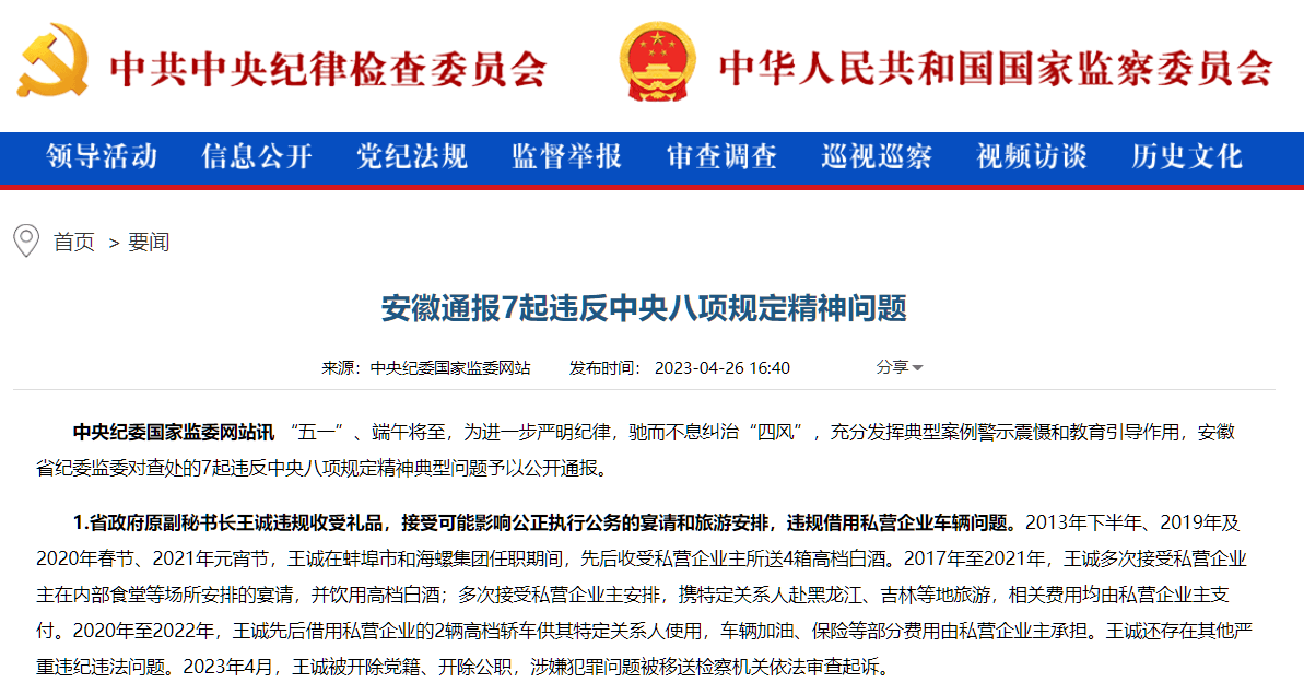 在通過(guò)近一年的調(diào)查之后,王誠(chéng)違紀(jì)違法問(wèn)題被公布于眾,根據(jù)安徽省紀(jì)委監(jiān)委通報(bào)了7起違反中央八項(xiàng)規(guī)定精神問(wèn)題稱,2013年下半年、2019年及2020年春節(jié)、2021年元宵節(jié),王誠(chéng)在蚌埠市和海螺集團(tuán)任職期間,先后收受私營(yíng)企業(yè)主所送4箱高檔白酒。