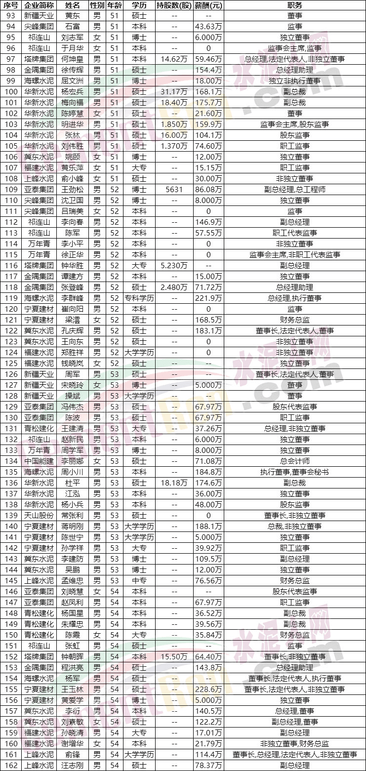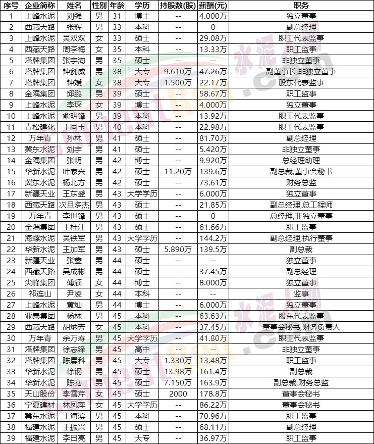 據水泥人網了解,部分水泥集團已明確年齡在58歲的高管退居二線,從上市公司公布的數據也可見出生于1970-1980年間的管理層為目前行業(yè)的主力,且多為本科及以上學歷。