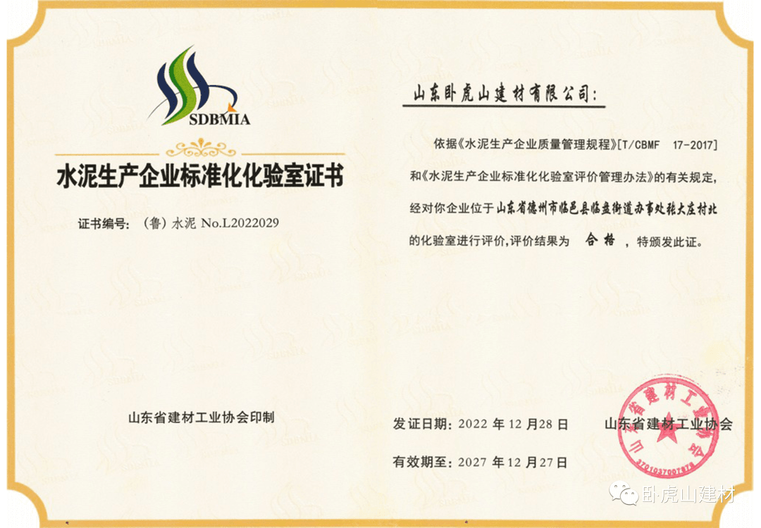 多年來,臥虎山建材出品水泥在省、市化驗室的檢驗結(jié)果都是業(yè)內(nèi)佼佼者,憑借強大的技術(shù)力量、先進的生產(chǎn)設(shè)備、可靠的原料質(zhì)量和過硬的產(chǎn)品質(zhì)量,臥虎山建材先后獲得全省水泥生產(chǎn)企業(yè)標(biāo)準(zhǔn)化化驗室證書、全省2022年水泥物理檢驗和化學(xué)分析大對比全合格單位等榮譽稱號。