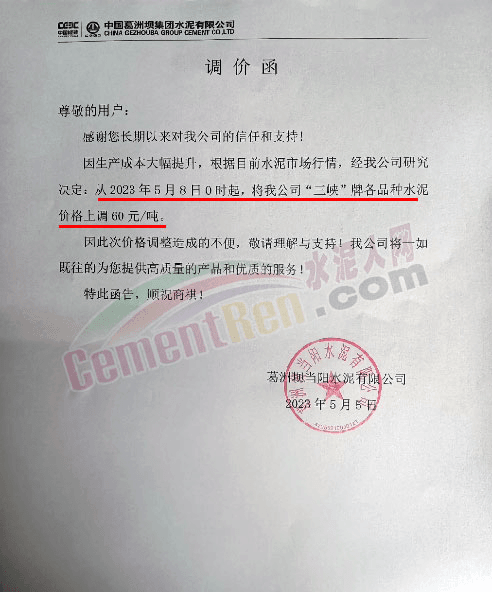 據(jù)了解,自年初以來水泥市場波動頻繁,部分區(qū)域水泥價格已然觸底。5月5日葛洲壩當(dāng)陽水泥有限公司通知稱,因生產(chǎn)成本大幅提升,根據(jù)目前水泥市場行情,經(jīng)公司研究決定從2023年5月8日0時起,將公司“三峽”牌各品種水泥價格上調(diào)60元/噸。