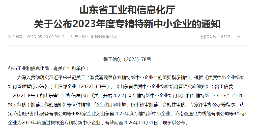 5月10日,山東省工業(yè)和信息化廳發(fā)布“2023年度專精特新中小企業(yè)”通知名單,山東永正產(chǎn)業(yè)技術(shù)研究院憑借自身實力和專業(yè)技術(shù),通過層層專業(yè)評審榮登榜單。